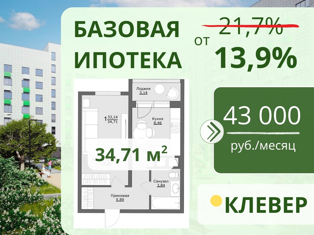 У нас отличные новости! Базовая Ипотека от 13.9% годовых теперь доступна всем в ЖК КЛЕВЕР ☘️